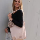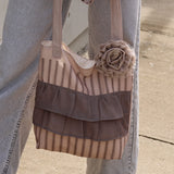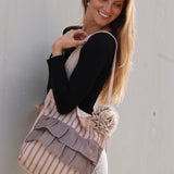 Bolso confeccionado en tela resistente con detalles de volantes en contraste. Incluye asas largas para llevar al hombro y un diseño amplio para acompañarte en tu día a día.