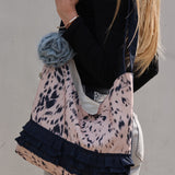 Bolso confeccionado en tela resistente con detalles de volantes en contraste. Incluye asas largas para llevar al hombro y un diseño amplio para acompañarte en tu día a día.