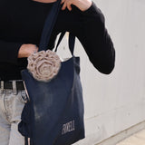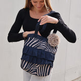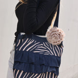 Bolso confeccionado en tela resistente con detalles de volantes en contraste. Incluye asas largas para llevar al hombro y un diseño amplio para acompañarte en tu día a día.