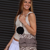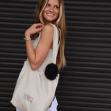 Bolso confeccionado en tela resistente con detalles de volantes en contraste. Incluye asas largas para llevar al hombro y un diseño amplio para acompañarte en tu día a día.