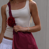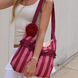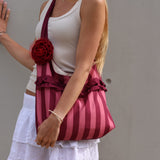 Bolso confeccionado en tela resistente con detalles de volantes en contraste. Incluye asas largas para llevar al hombro y un diseño amplio para acompañarte en tu día a día.