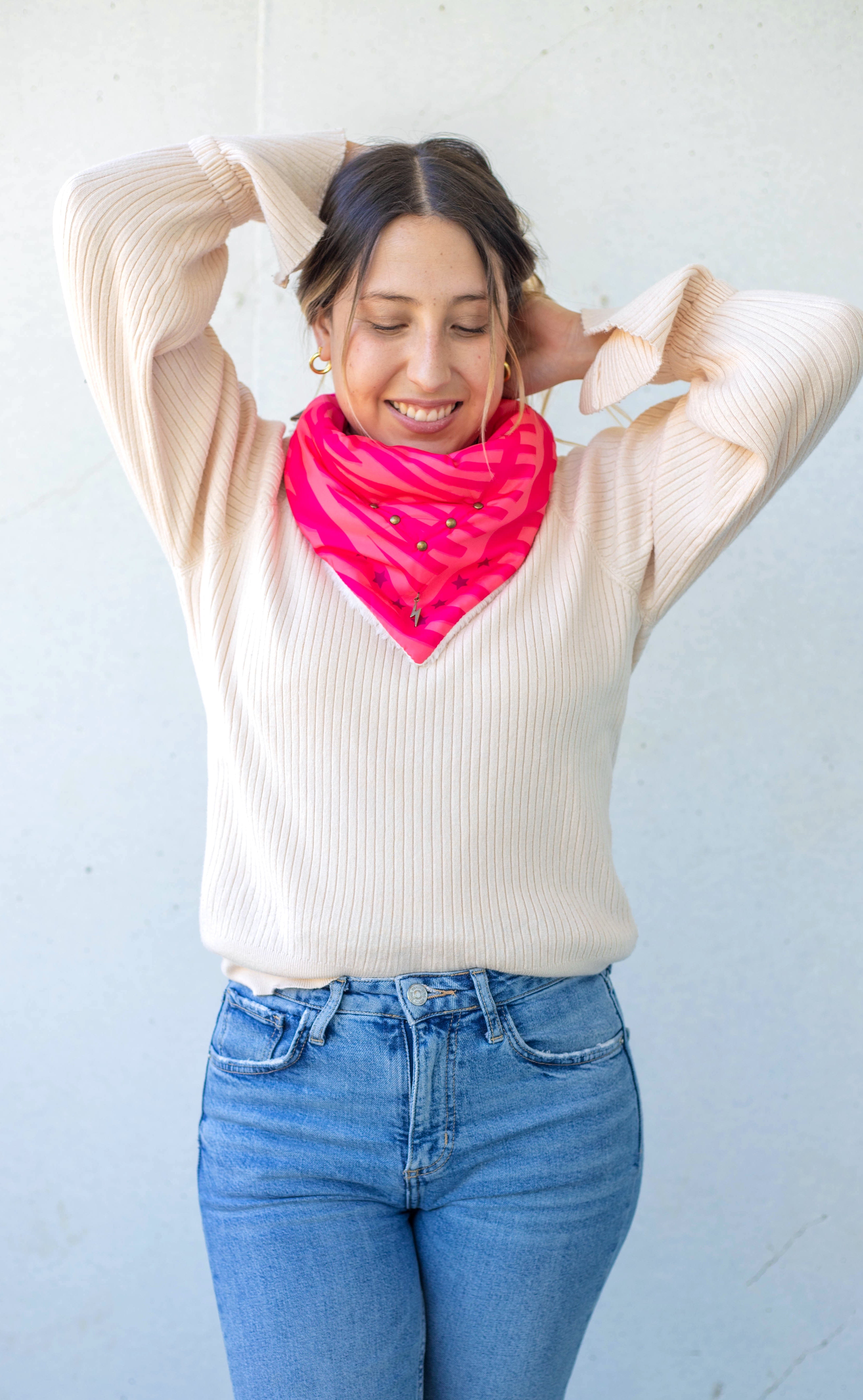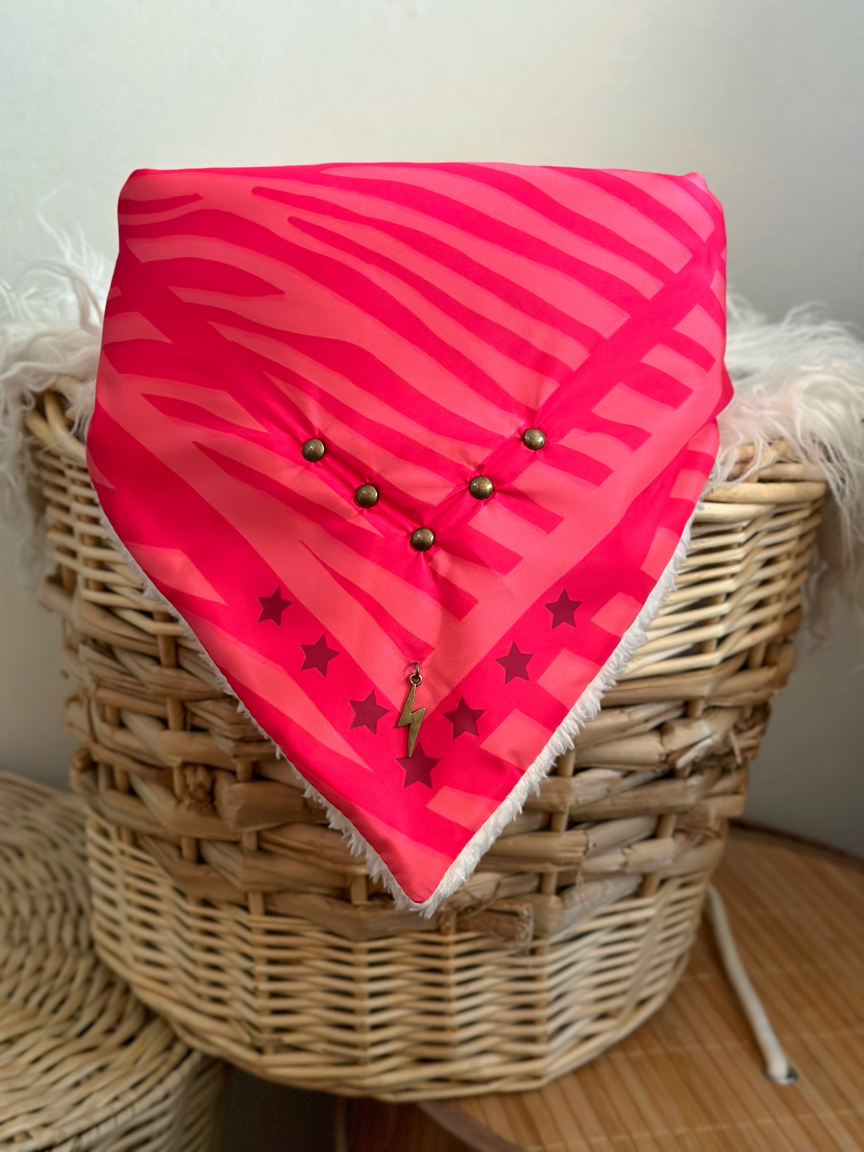 Pañuelo con chiporro con estampado propio. Incluidas tachas y aplicaciones en su borde. Se amarran por medio de un broche en donde lo puedes ajustar moviendo el botón a tu gusto!