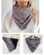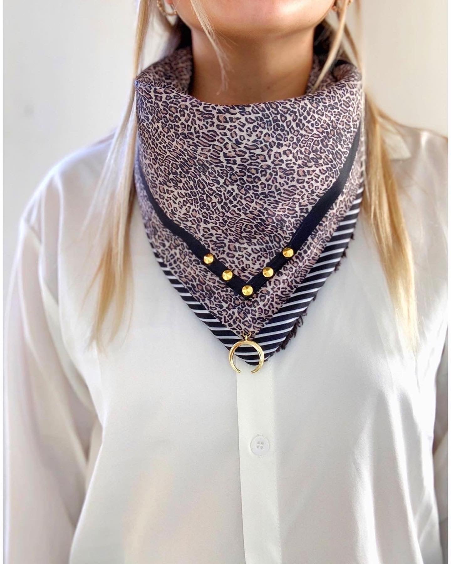 Pañuelo con chiporro con estampado propio. Incluidas tachas y aplicaciones en su borde. Se amarran por medio de un broche en donde lo puedes ajustar moviendo el botón a tu gusto!
