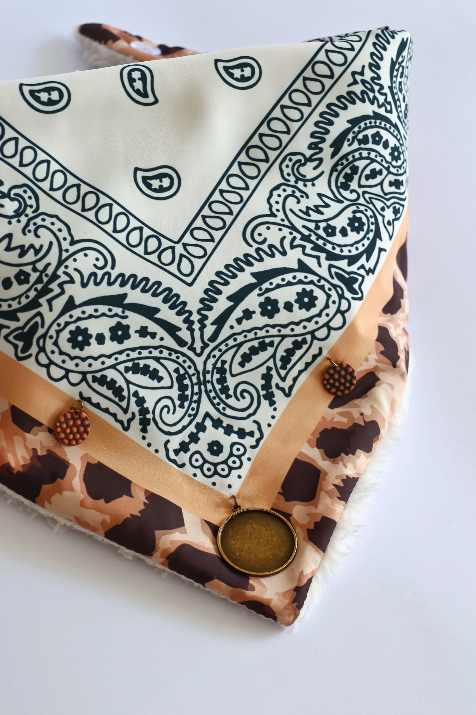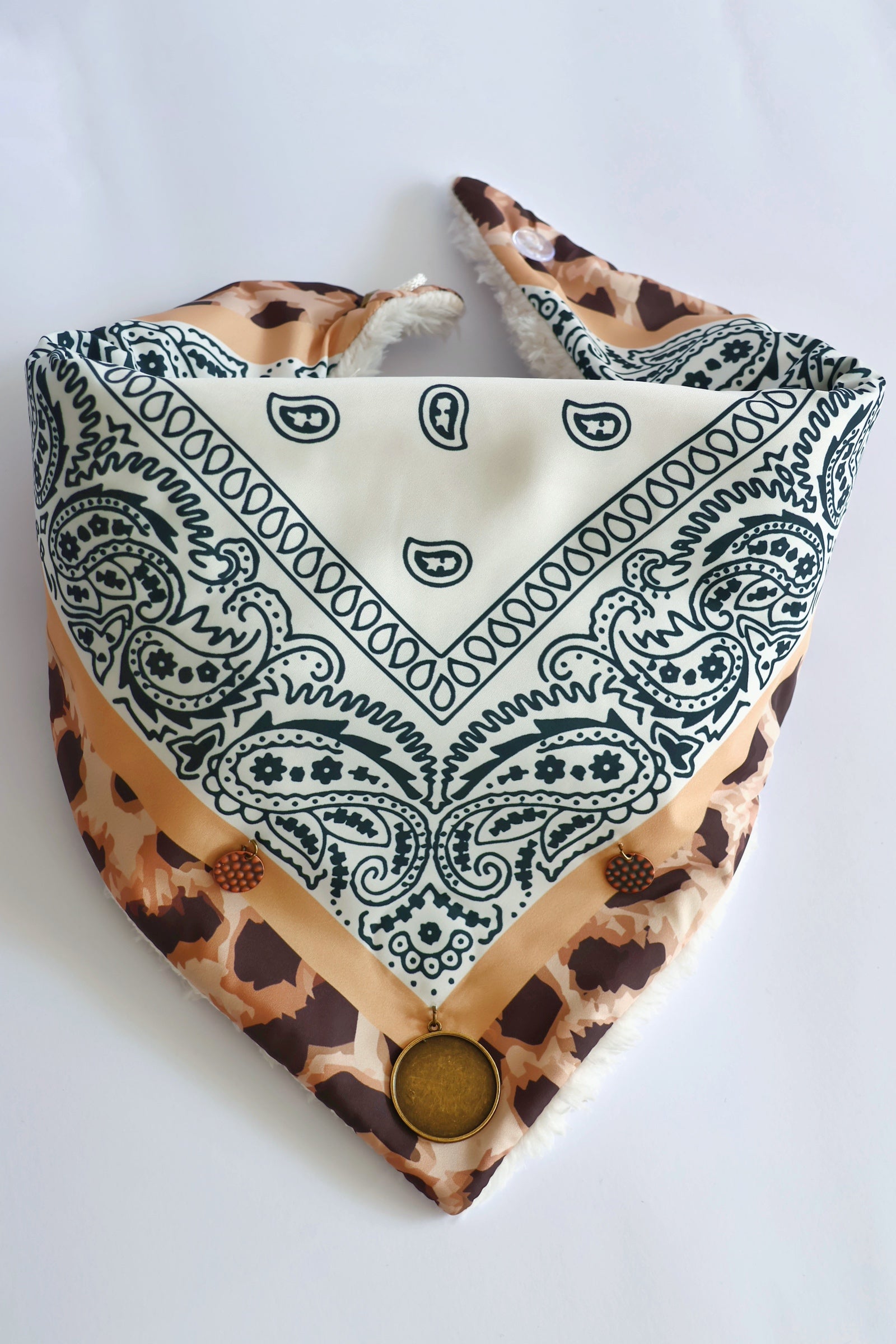Pañuelo con chiporro con estampado propio. Incluidas tachas y aplicaciones en su borde. Se amarran por medio de un broche en donde lo puedes ajustar moviendo el botón a tu gusto!