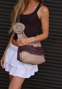 Bolso confeccionado en tela resistente con detalles de volantes en contraste. Incluye asas largas para llevar al hombro y un diseño amplio para acompañarte en tu día a día.