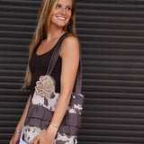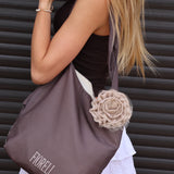 Bolso confeccionado en tela resistente con detalles de volantes en contraste. Incluye asas largas para llevar al hombro y un diseño amplio para acompañarte en tu día a día.