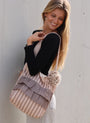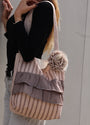 Bolso confeccionado en tela resistente con detalles de volantes en contraste. Incluye asas largas para llevar al hombro y un diseño amplio para acompañarte en tu día a día.