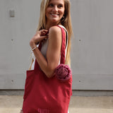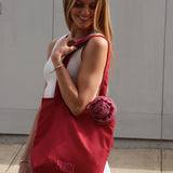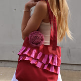 Bolso confeccionado en tela resistente con detalles de volantes en contraste. Incluye asas largas para llevar al hombro y un diseño amplio para acompañarte en tu día a día.