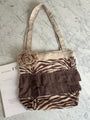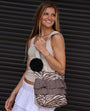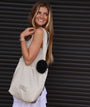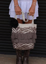 Bolso confeccionado en tela resistente con detalles de volantes en contraste. Incluye asas largas para llevar al hombro y un diseño amplio para acompañarte en tu día a día.