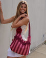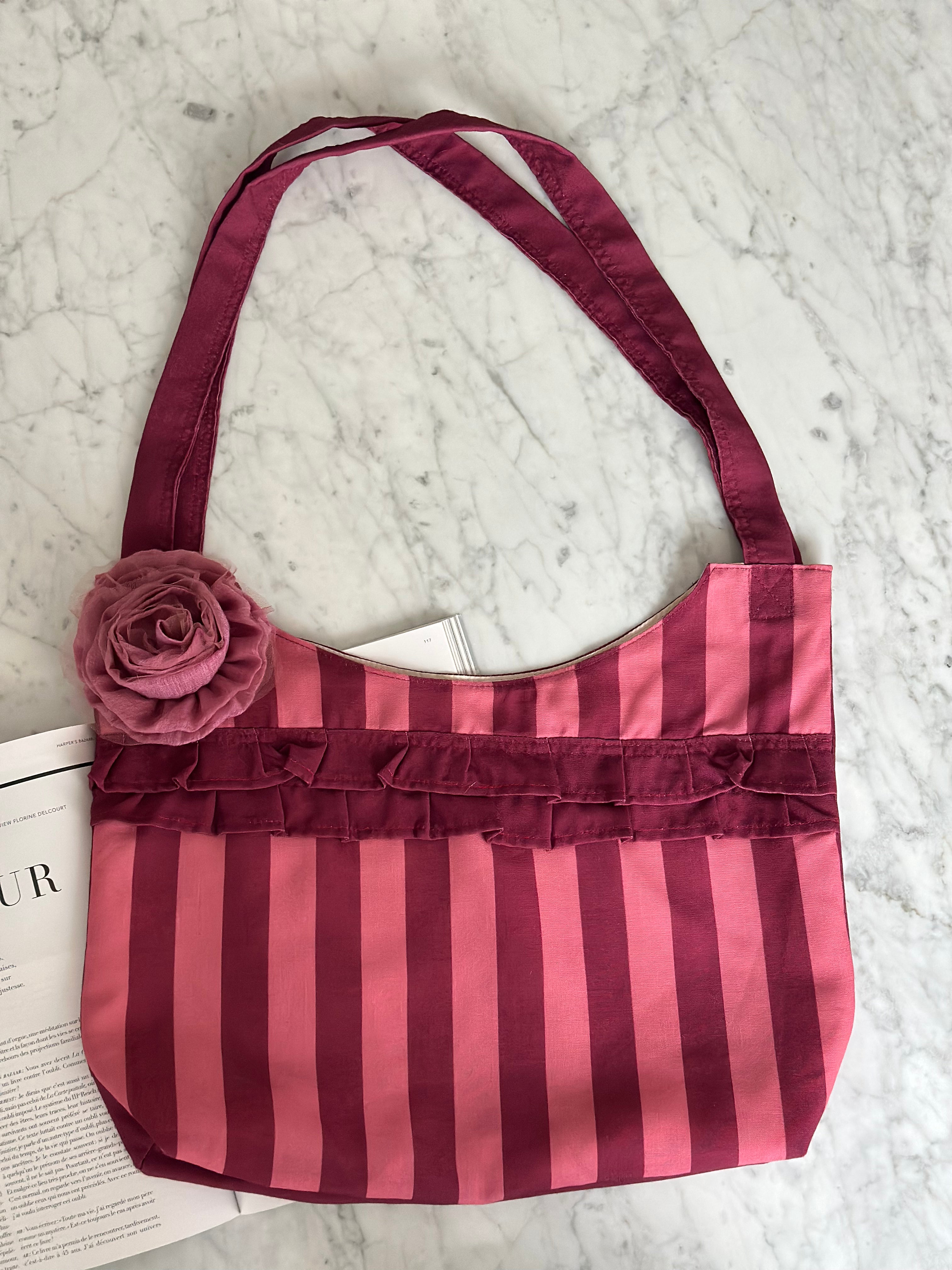 Bolso confeccionado en tela resistente con detalles de volantes en contraste. Incluye asas largas para llevar al hombro y un diseño amplio para acompañarte en tu día a día.