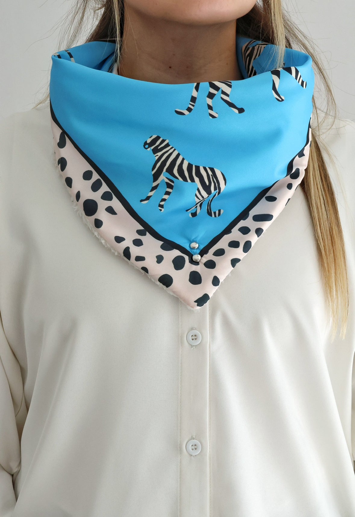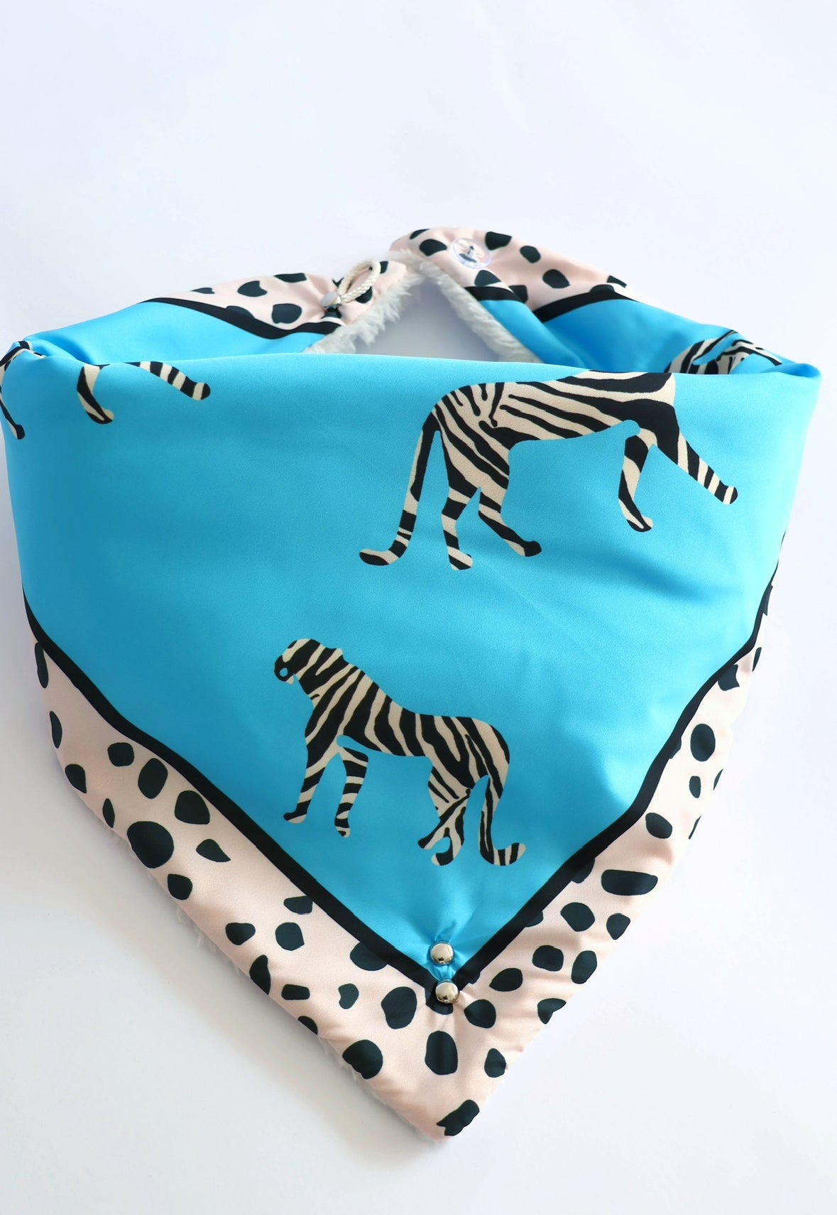Pañuelo con chiporro con estampado propio. Incluidas tachas y aplicaciones en su borde. Se amarran por medio de un broche en donde lo puedes ajustar moviendo el botón a tu gusto!