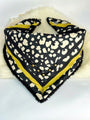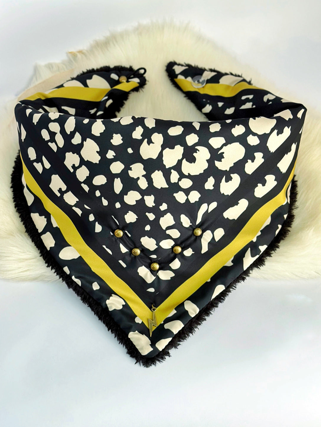 Pañuelo con chiporro con estampado propio. Incluidas tachas y aplicaciones en su borde. Se amarran por medio de un broche en donde lo puedes ajustar moviendo el botón a tu gusto!