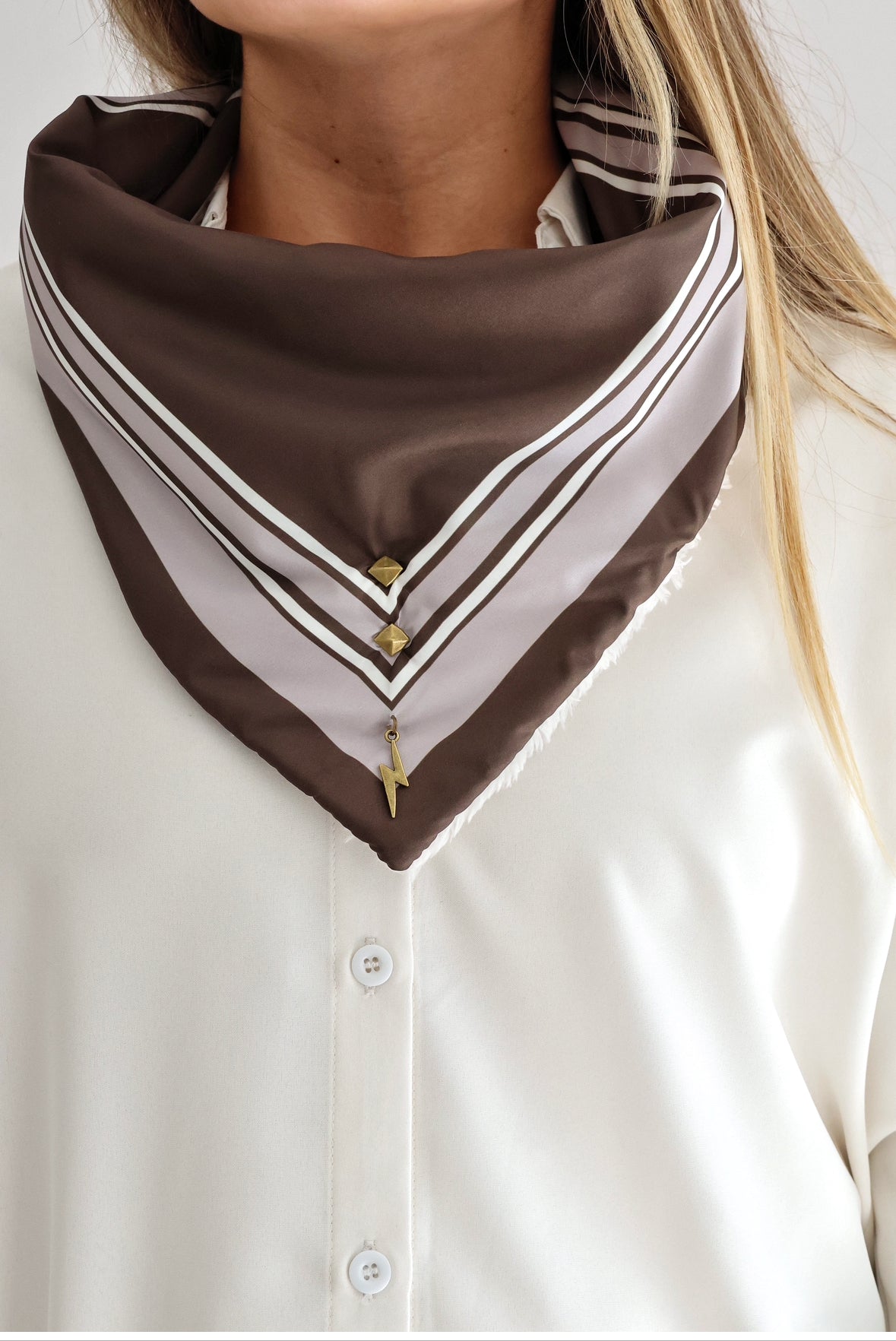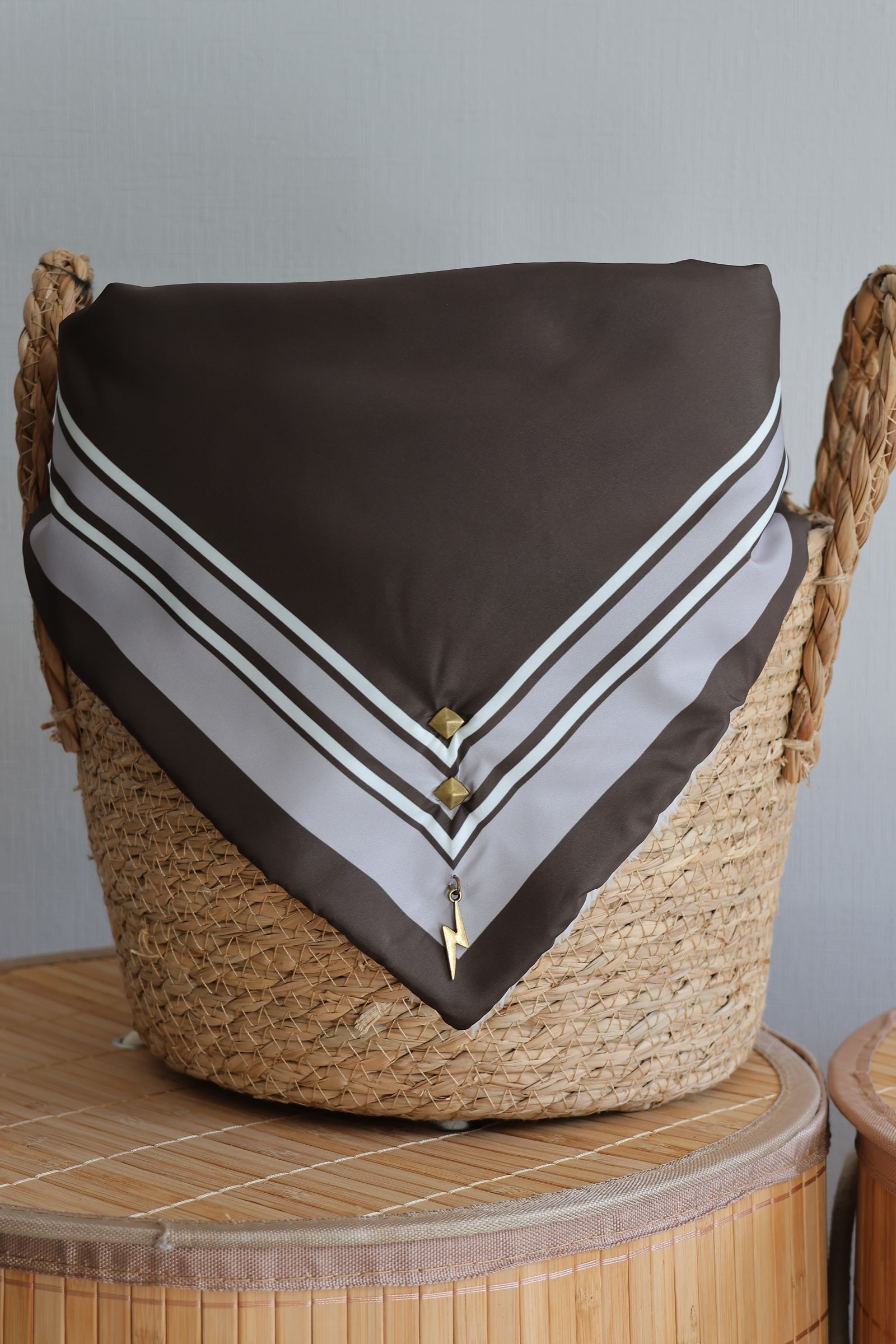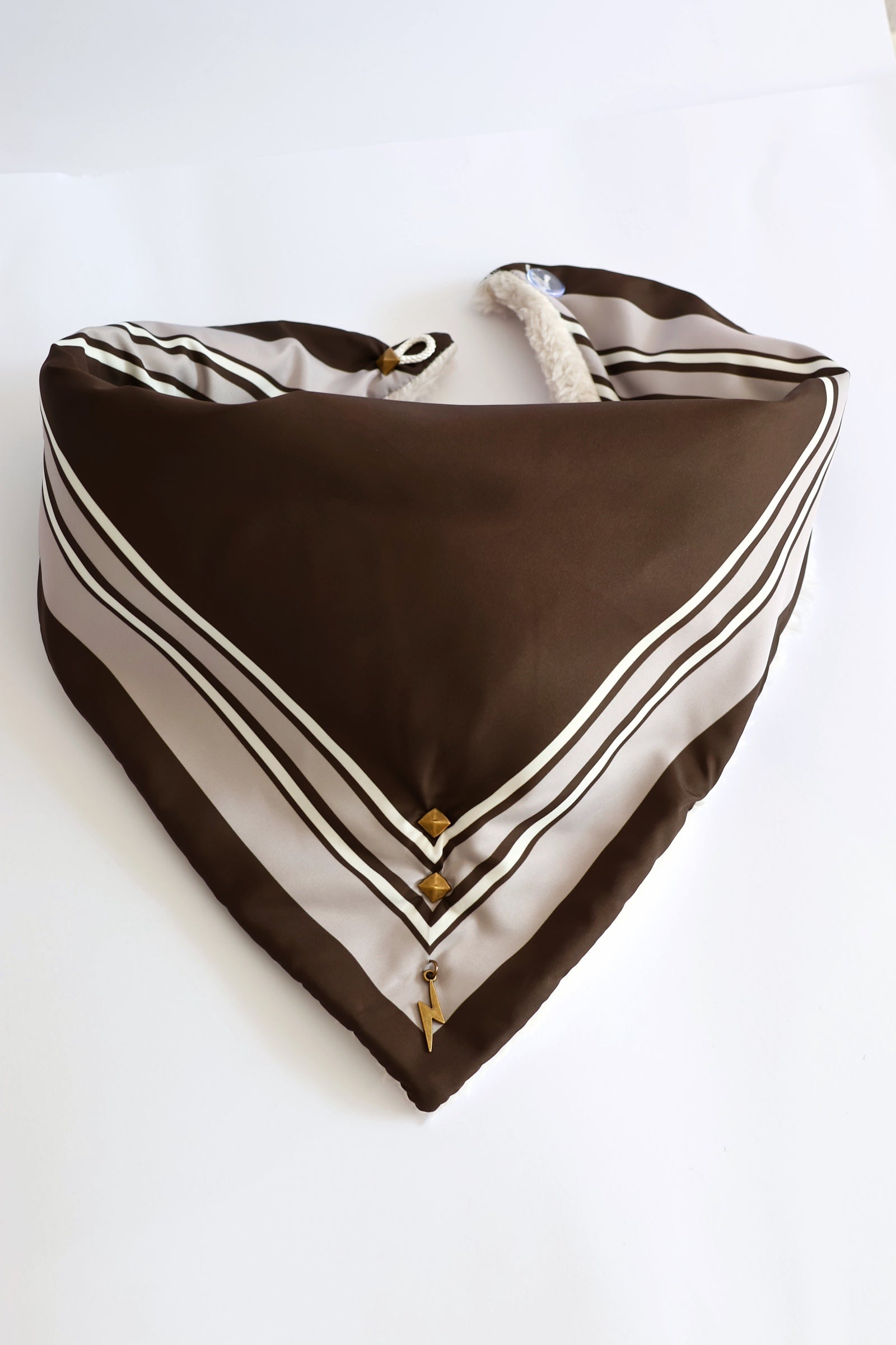 Pañuelo con chiporro con estampado propio. Incluidas tachas y aplicaciones en su borde. Se amarran por medio de un broche en donde lo puedes ajustar moviendo el botón a tu gusto!