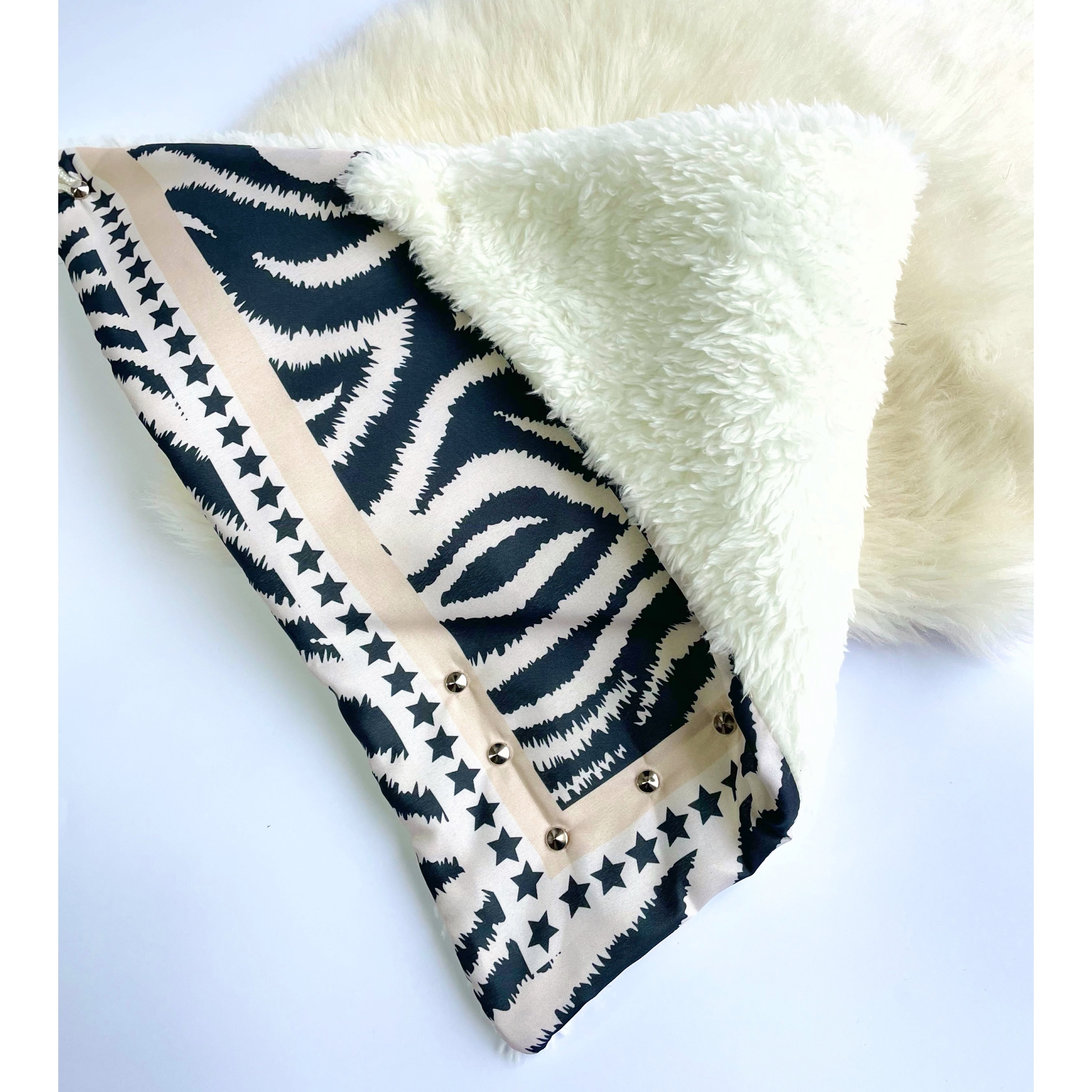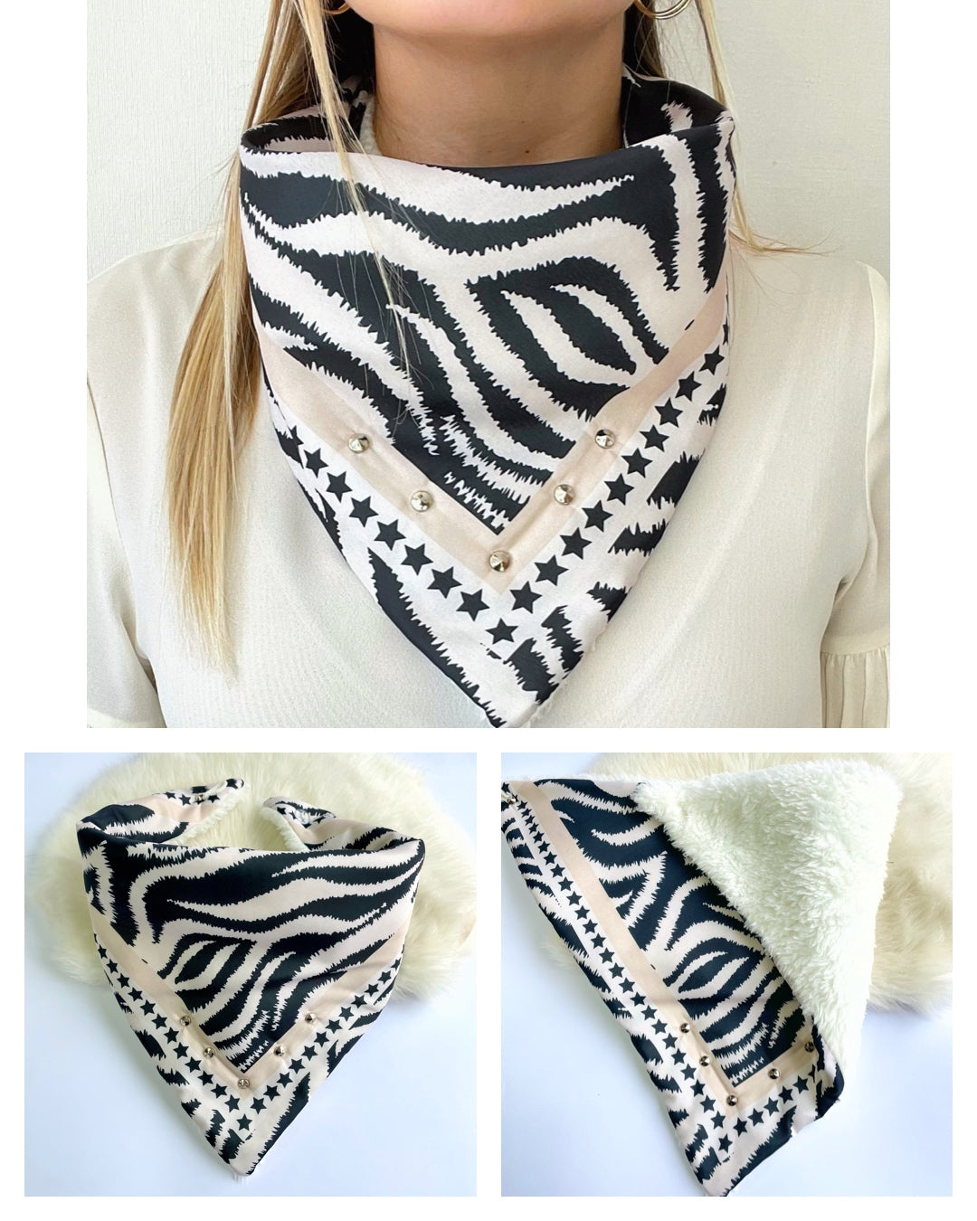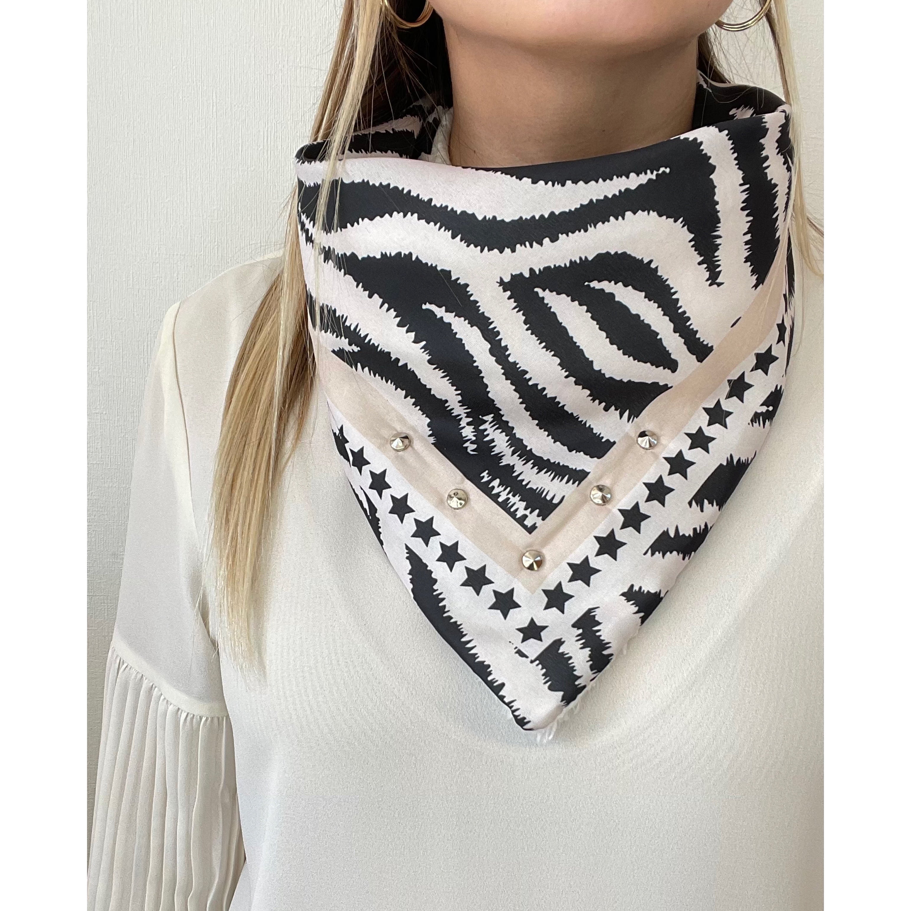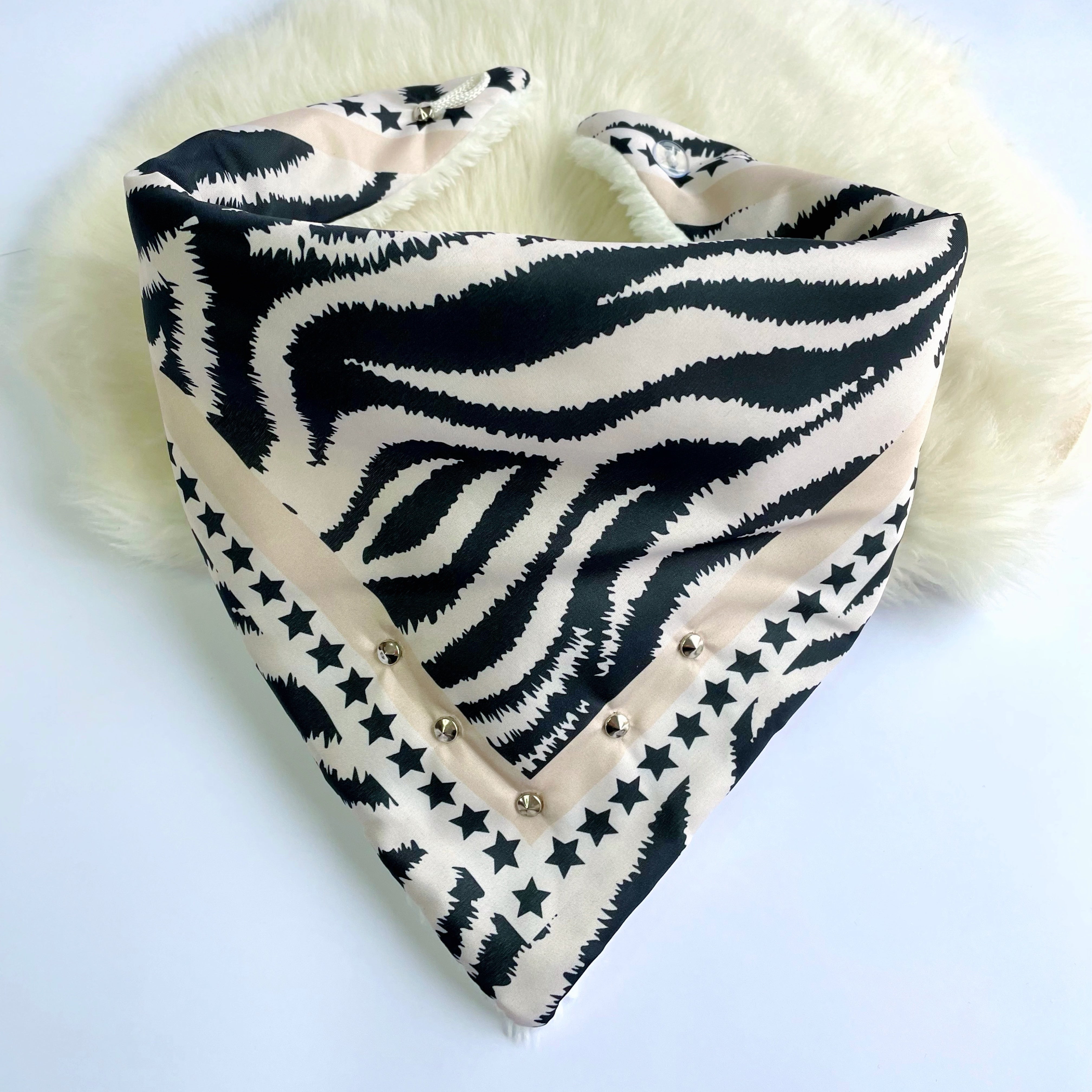 Pañuelo con chiporro con estampado propio. Incluidas tachas y aplicaciones en su borde. Se amarran por medio de un broche en donde lo puedes ajustar moviendo el botón a tu gusto!