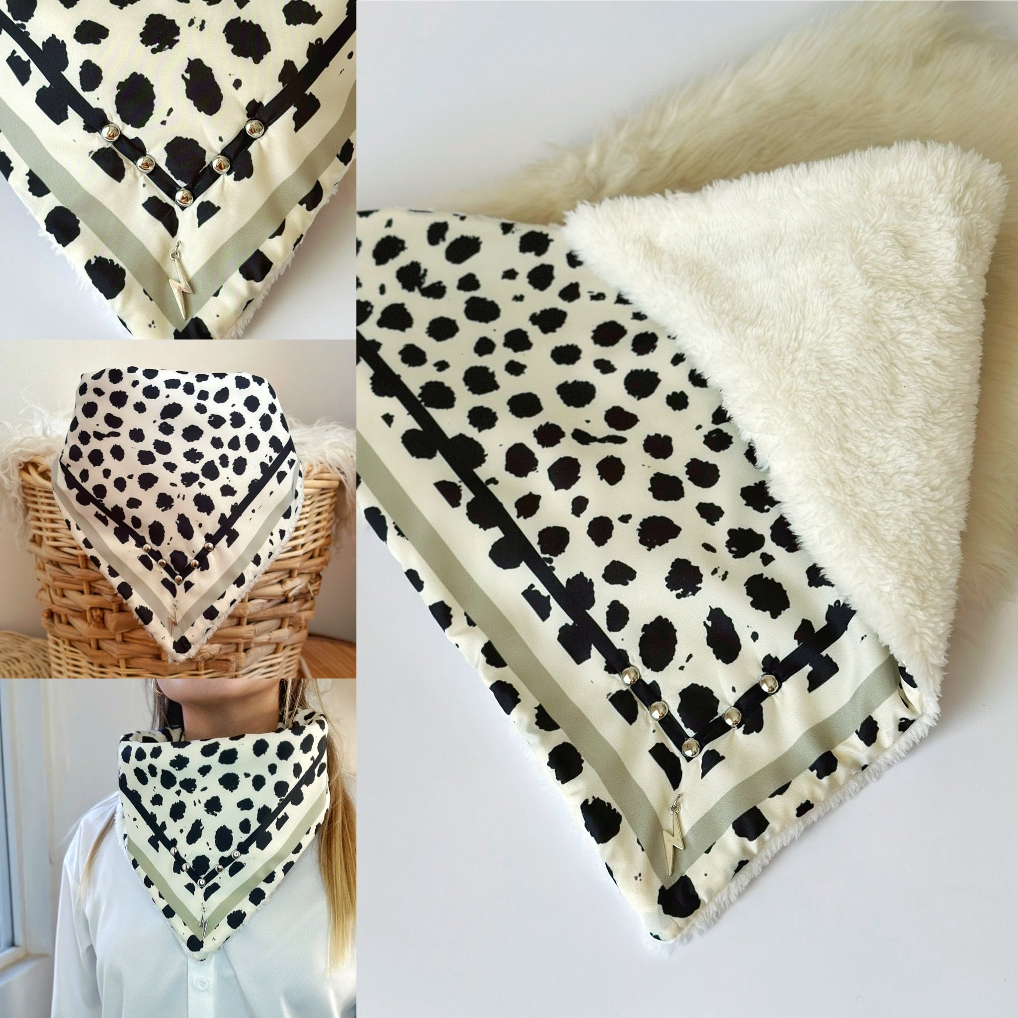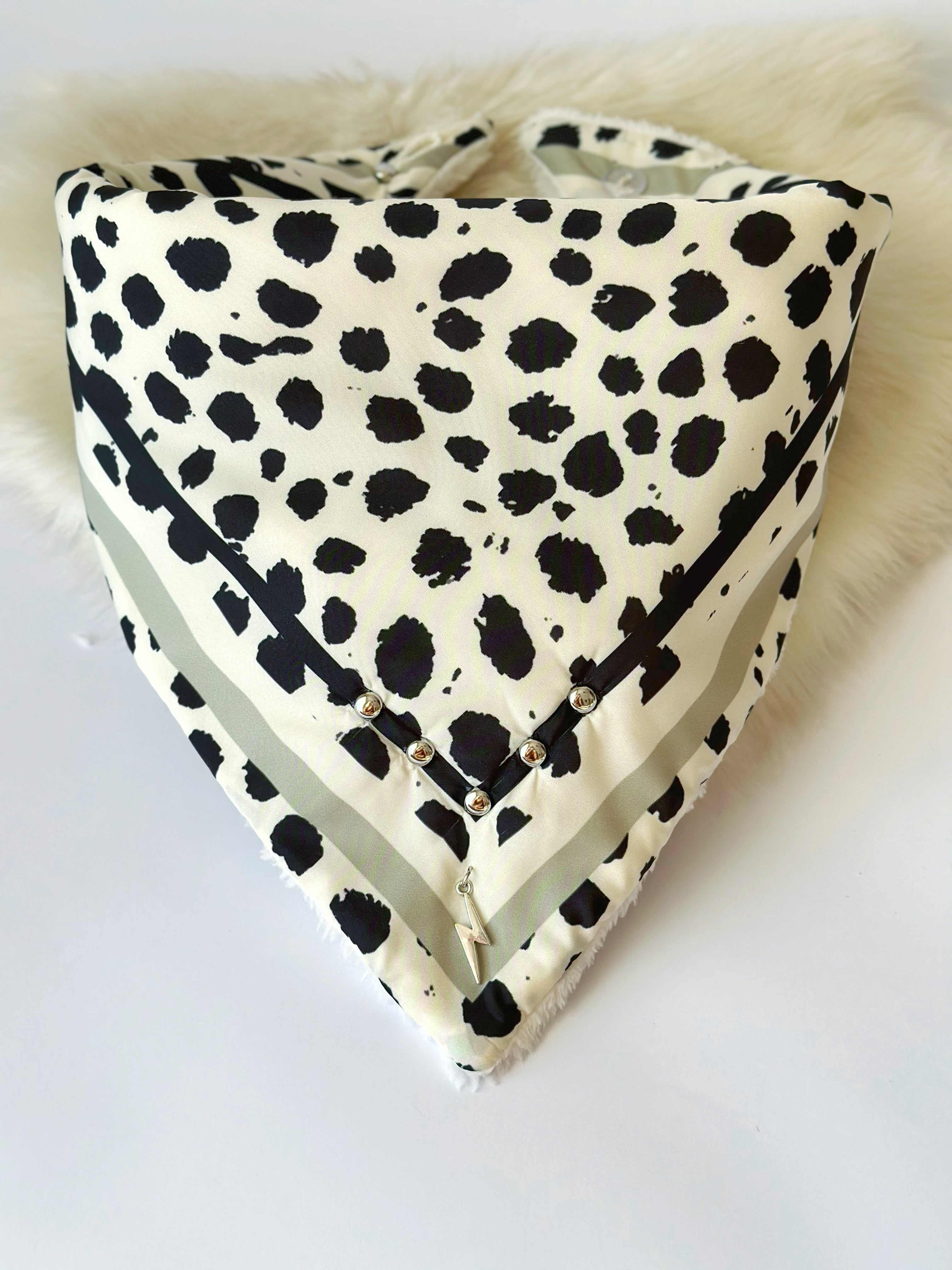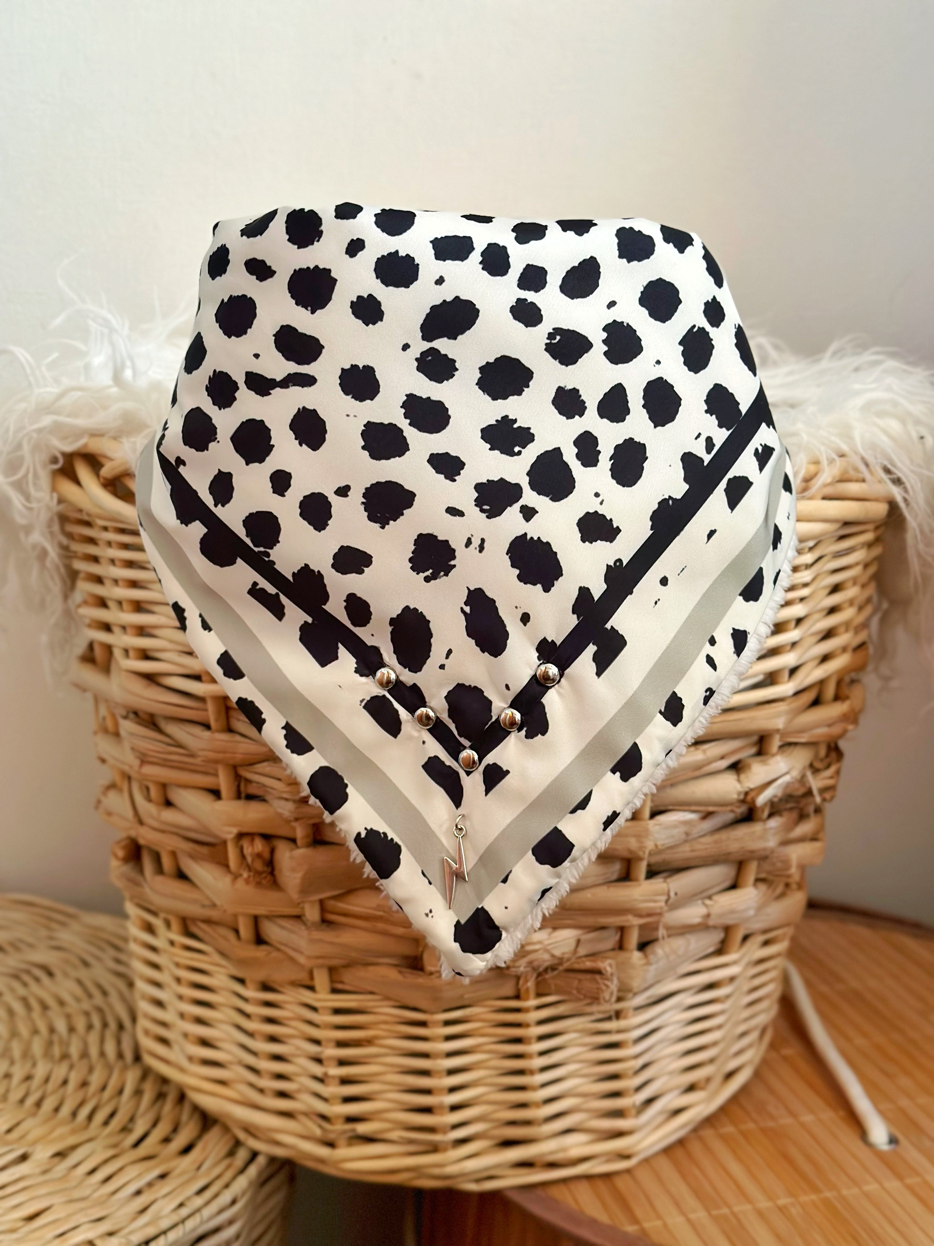 Pañuelo con chiporro con estampado propio. Incluidas tachas y aplicaciones en su borde. Se amarran por medio de un broche en donde lo puedes ajustar moviendo el botón a tu gusto!
