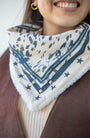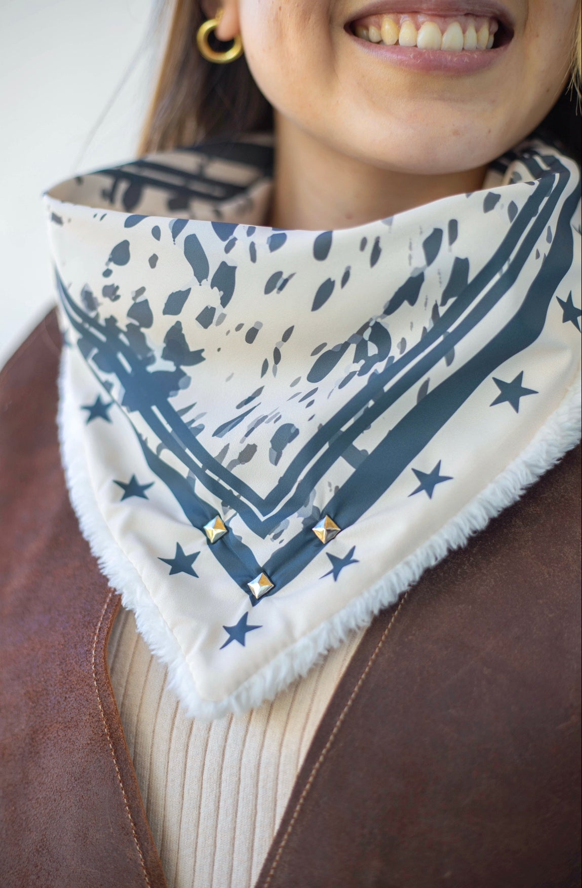 Pañuelo con chiporro con estampado propio. Incluidas tachas y aplicaciones en su borde. Se amarran por medio de un broche en donde lo puedes ajustar moviendo el botón a tu gusto!
