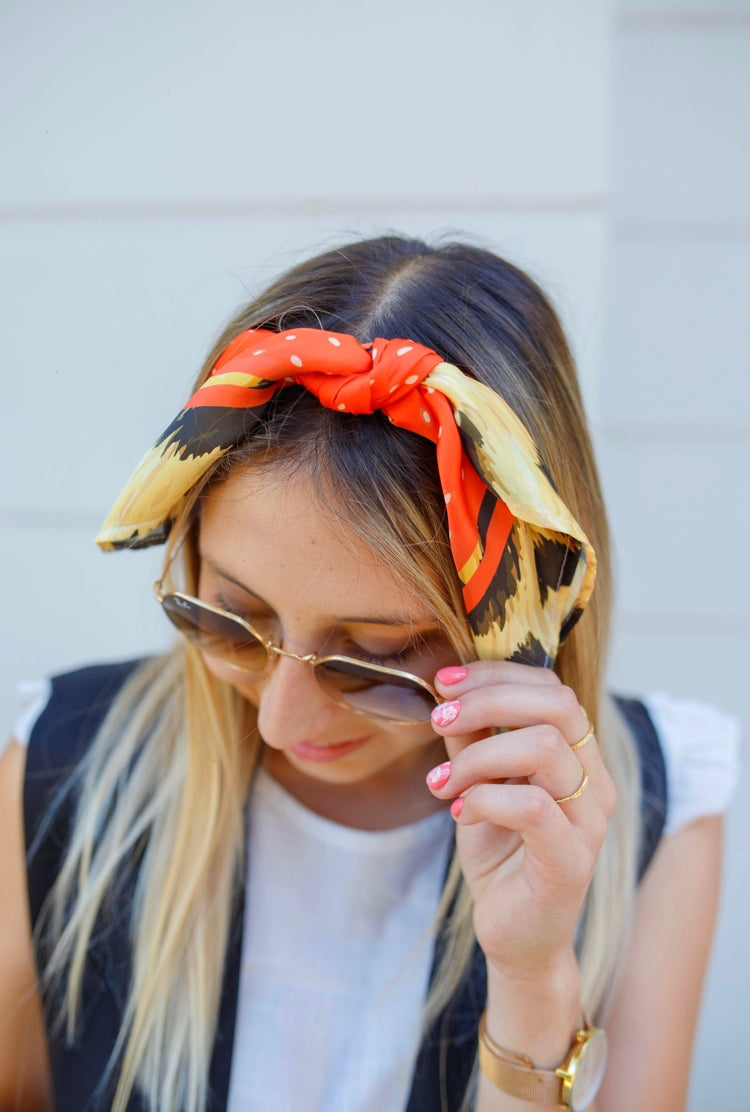 - En el cuello! Usarlo como típico pañuelo amarrado detrás de la cabeza o cruzado delante como “estilo azafata”