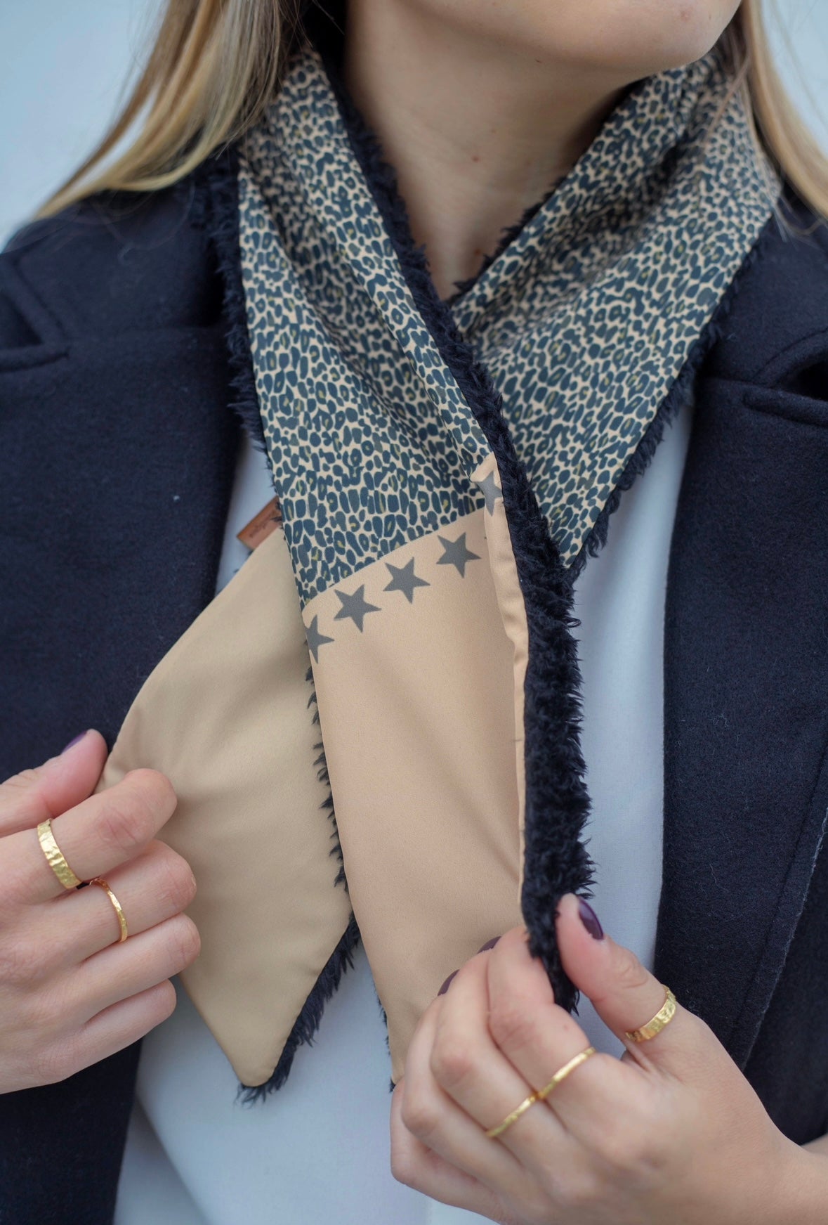 Pañuelo estilo francés con diseño único. Tienen un broche a presión para ser utilizados