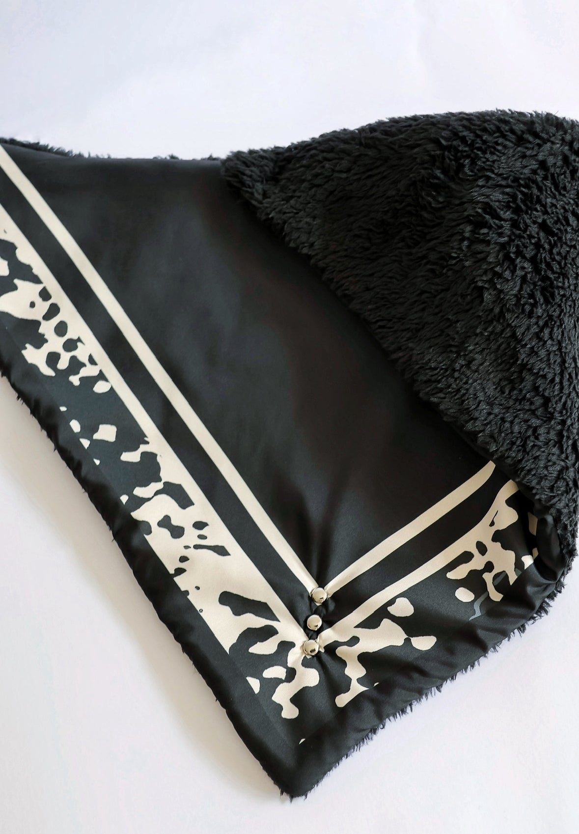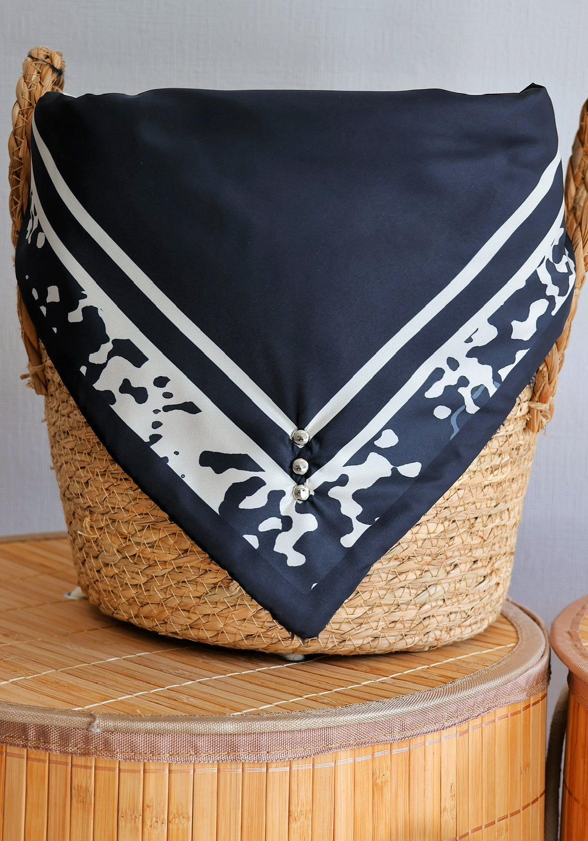 Pañuelo con chiporro con estampado propio. Incluidas tachas y aplicaciones en su borde. Se amarran por medio de un broche en donde lo puedes ajustar moviendo el botón a tu gusto!